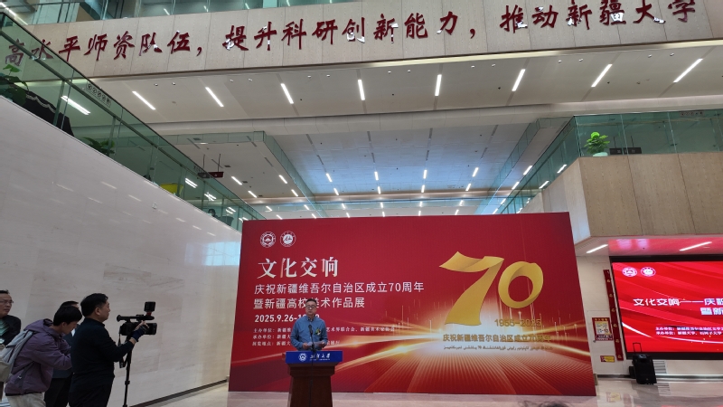 2025年9月26日下午,“文化交响:庆祝新疆维吾尔自治区成立70周年暨新疆高校美术作品展”开幕式在新疆大学博达校区隆重举行。永利集团-澳门永利集团 党委书记宋育果带队,副院长杜瑶,美术与设计系副书记李钦曾、副主任杨超一行出席活动,与全疆高校代表共同见证这一文化盛事。