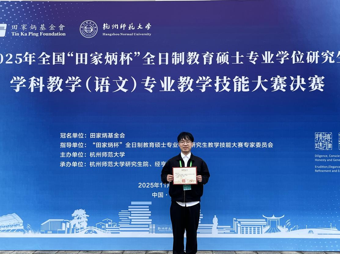 11月9日,由田家炳教育基金会、杭州师范大学及杭州师范大学经亨颐教育学院联合主办的2025年全国“田家炳杯”全日制教育硕士专业学位研究生学科教学(语文)专业技能大赛决赛圆满结束。我校永利集团 2024级学科教学(语文)专业研究生蒋前铭,在吴新锋教授的悉心指导下,凭借扎实的教学功底、创新的教学设计及出色的现场表现,从全国128所高校的173名顶尖选手中脱颖而出,荣获国家一等奖,成为新疆(兵团)该赛事首位一等奖得主及首位国省校大满贯得主,实现了我校在学科教学(语文)领域国家级赛事的历史性突破!
