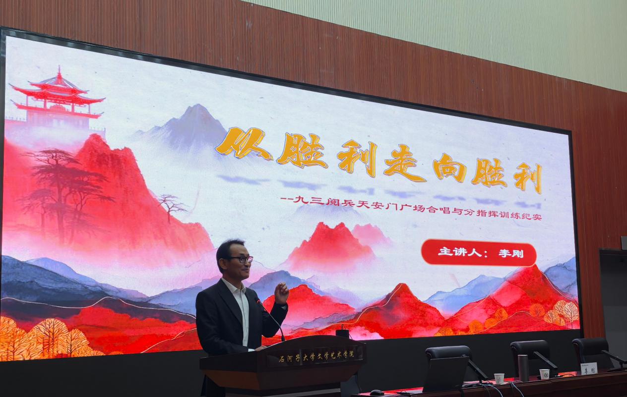 基于国庆60周年、70周年盛典等国家重大庆典活动中大型合唱与分指挥训练总指挥的经验,李刚教授从八个核心维度展开了深入分享。首先梳理抗战历史脉络,借助一分短视频直观再现那段艰苦卓绝的峥嵘岁月,深入解读抗战精神内涵,深情缅怀赵一曼、杨靖宇、赵尚志等英雄先辈,阐释“钢铁般的意志”这一精神内核,并将其与石河子军垦精神相联系明确音乐教育者的时代职责与使命。同时,他系统剖析抗日战争胜利的伟大意义与阅兵活动的历史价值,助力现场师生深刻领会历史与庆典的深层关联。