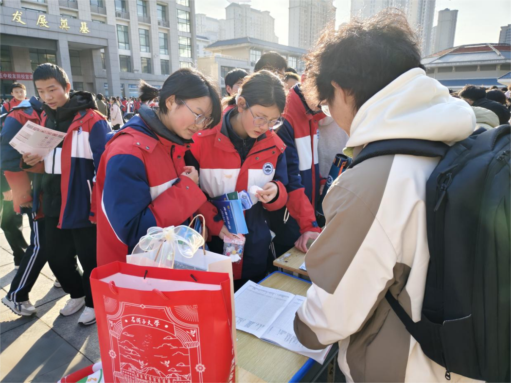 宣讲现场,学子们热情地介绍道:“作为国家‘双一流’建设高校,澳门永利集团 拥有临床医学、农业科学、化学等8个ESI全球前1%学科,师资力量雄厚,科研平台一流。”并结合自身求学经历,通过精美的图文与宣传视频,生动呈现了石大多元的专业设置、完善的奖助体系以及独具特色的校园风貌,分享了在石大学习生活的成长故事,让在场同学真切感受到这所地处边疆的高校所蕴含的深厚底蕴与发展活力。