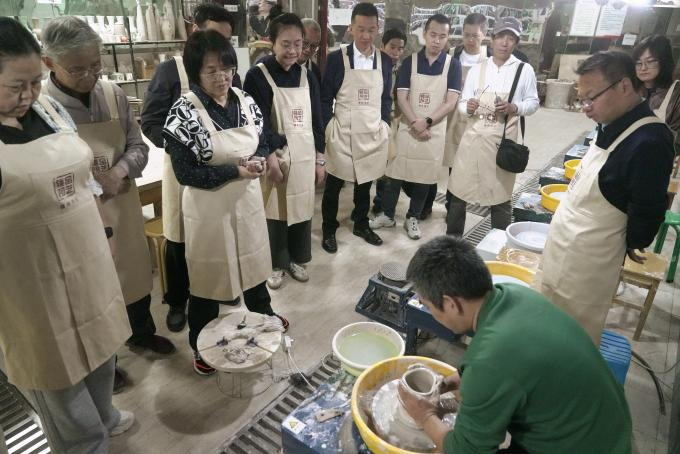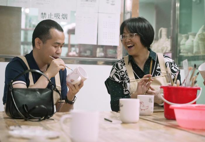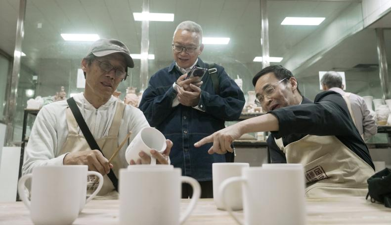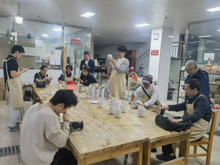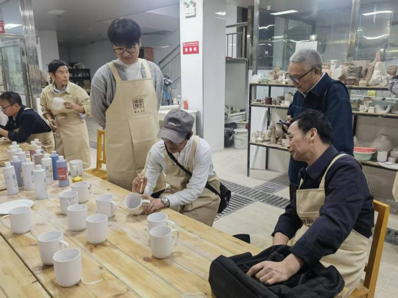 非遗项目体验环节,银龄教师与青年教师结对合作,在陶艺捏塑与画坯技艺中感受传统文化之美。老教师们将多年治学经验与心得娓娓道来,青年教师则围绕科研困惑、教学创新等话题虚心求教,现场氛围融洽而热烈。